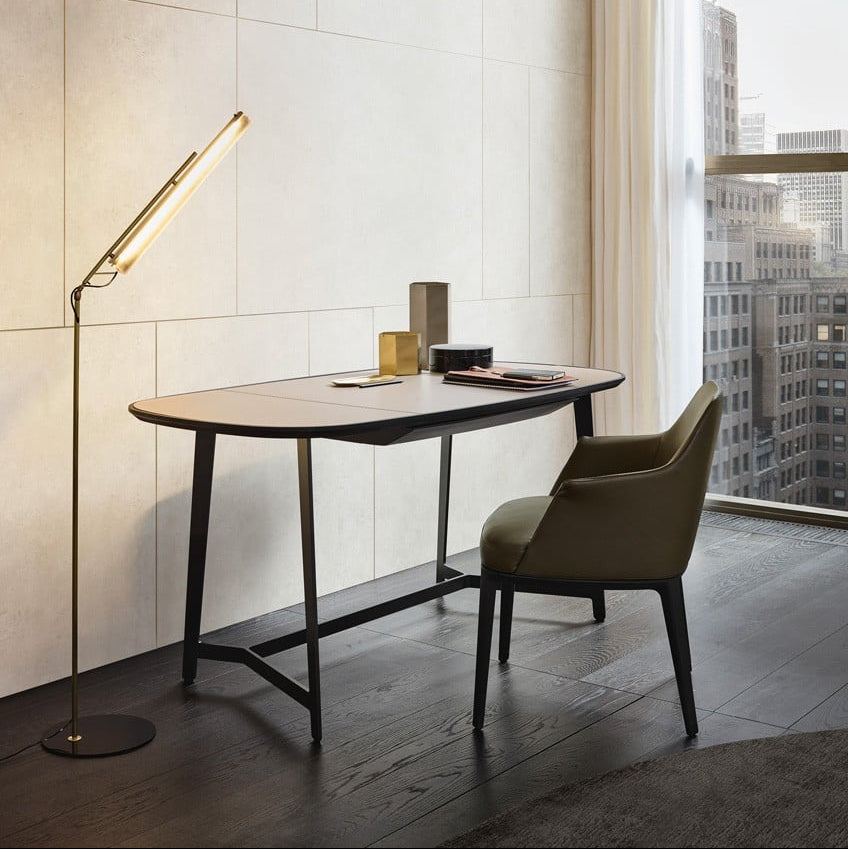 Bordplaten, med en treramme og innfelt skinn, følger subtile kurver som myker opp de stramme linjene i den lakkerte metallstrukturen.